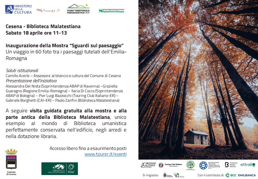 Arriva alla Biblioteca Malatestiana di Cesena, dal 18 aprile al 3 maggio, la mostra “Sguardi sul Paesaggio”, che espone sessanta fotografie dei paesaggi tutelati dell’Emilia-Romagna: una selezione tra le oltre 2000 arrivate da cittadini appassionati di fotografia coinvolti in un contest fotografico promosso dal Ministero della Cultura e dalla Regione Emilia-Romagna, grazie anche all’efficace sensibilizzazione svolta dalle associazioni che hanno collaborato alla diffusione del bando, tra cui la Federazione Italiana Associazioni Fotografiche, il Touring Club e il CAI.
